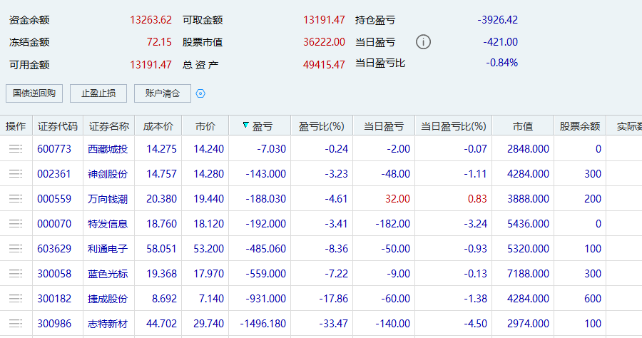 改变从今天开始,上周五割肉今天也不会亏那么多,唉,都怪自己优柔寡断。早盘也给了冲高机会,早盘一键清仓还亏不到300块,下不去手啊,后果就是越亏越多。去弱留强,该割肉的都割了,明天继续割。