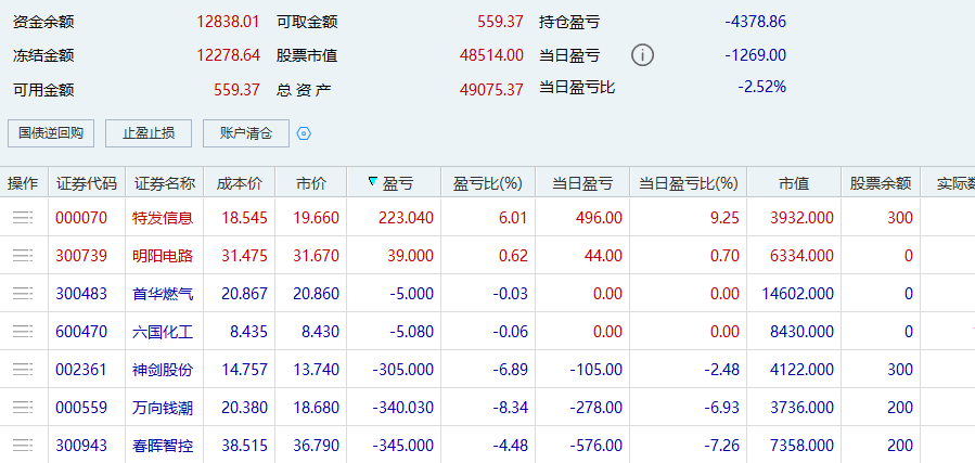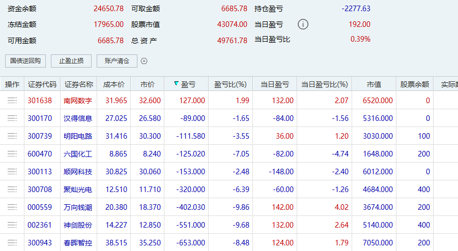 明日操作计划:还是看盈亏对冲,盈利金额能对冲亏损金额就一块清仓。暂定的计划是清仓南网数字,清仓汉得信息,清仓明阳电路,清仓六国化工,清仓顺网科技,清仓聚灿光电。明阳电路今天给了机会,但没把握住,实在是不想再亏损割肉了。