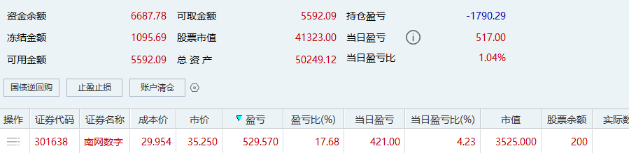 建仓春晖智控,早盘剩的钱不多,所以就只买了200股,清仓西藏城投的钱在珈伟新能和北京科锐两只股里选择了排板北京科锐,没想到守门守了一天。