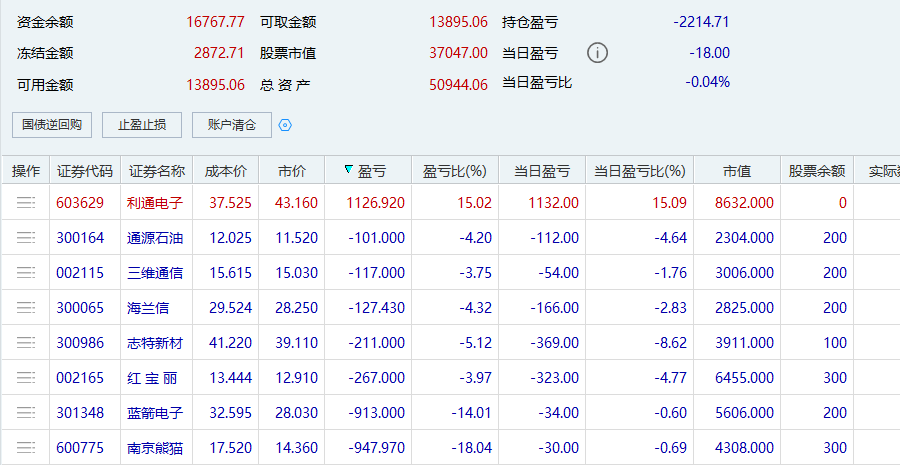 个人操作:低吸利通电子,这笔吸的好,不然今天得亏成狗。尾盘志特一个砸盘直接把今天的利润砸没了,42.4挂单了好几次都又撤了,唉。