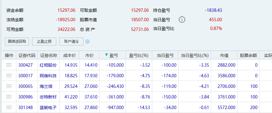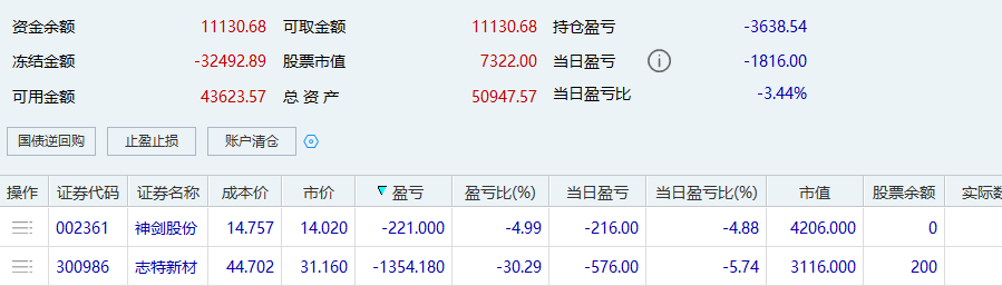 割肉了,都割肉了。回顾这段时间操作,蓝剑、志特不舍得割肉,导致越亏越多。红宝丽、通源不属于龙头,后排个股当成宝,导致越亏越多。天地在线跌停抄底,没有执行纪律,导致越亏越多。不知道自己在干什么,开超市,买后排个股,优柔寡断。