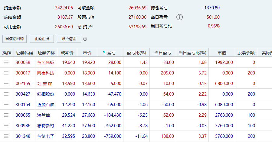 个人操作:能清的都清了,利通卖飞止盈,通润止盈,红宝丽止盈,红宝丽太弱了,今天百川、闰土都封板了,这家伙竟然冲高回落,还是散户太多。熊猫割肉,三维割肉。海兰信回本没卖掉,可惜了。新建仓位红相和网宿,被坑了,不然当日盈亏能有个一千左右。