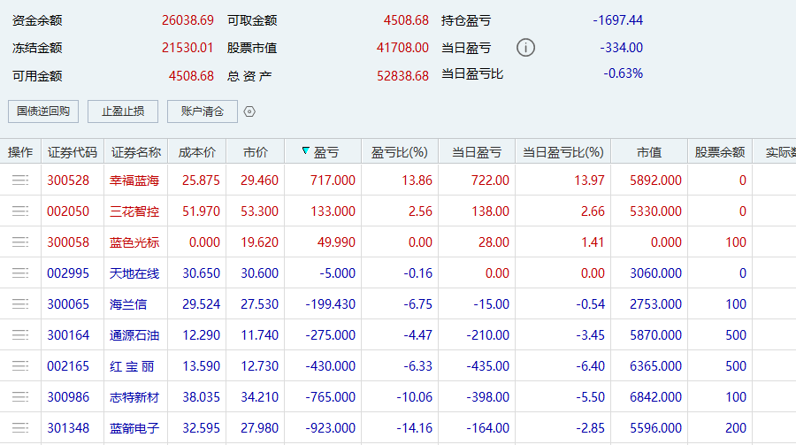 唉,辛辛苦苦两个星期一天跌完了,又回到了原点。竞价开盘就直接亏损1300,昨天全靠幸福蓝海这个神兵从亏损1000拉回了600多,今天没有了神兵,直接亏到收盘。
