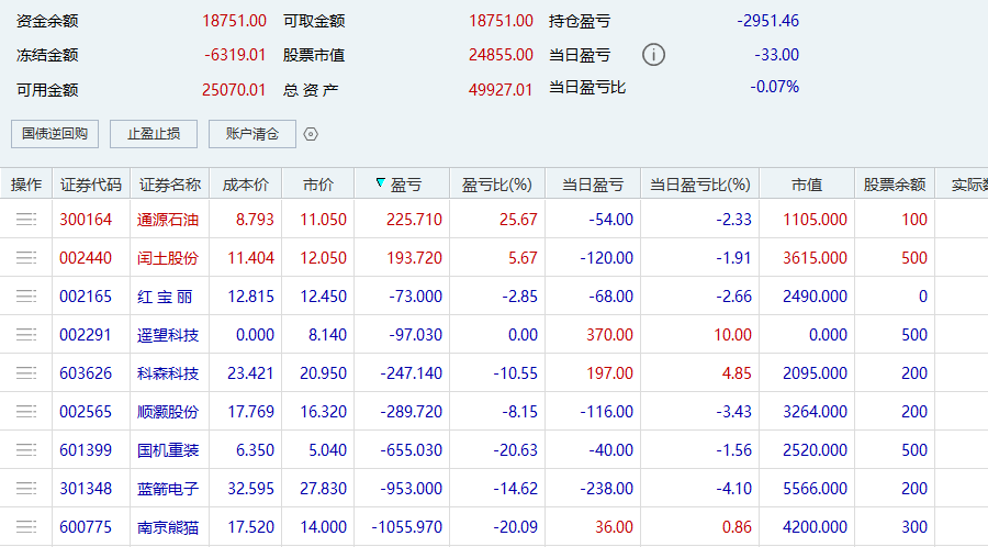 个人操作:今天做的不好,盘中最高盈利600元,尾盘又又又跌回去了。清遥望科技,烂板了,怕好不容易回本明天再跌回去。闰土、科森、顺灏都应该清仓,还是犹豫了。
